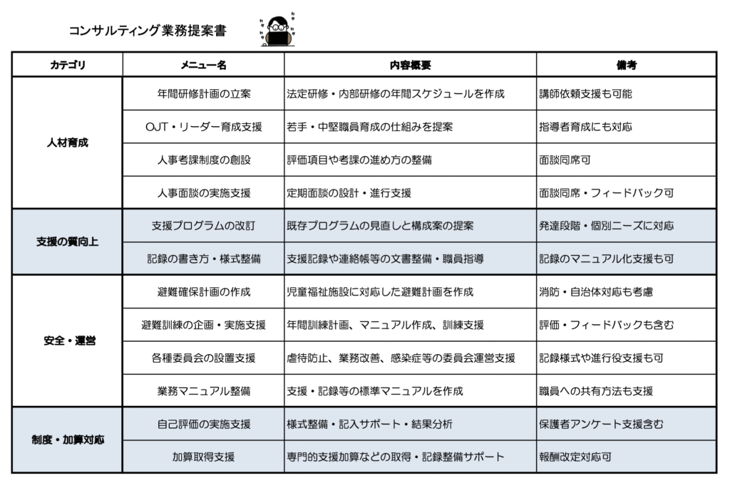 ・支援プログラムの作成・支援マニュアル等の各種マニュアル作成・業務フローや業務マニュアルの作成・直接支援業務のスーパーバイズ